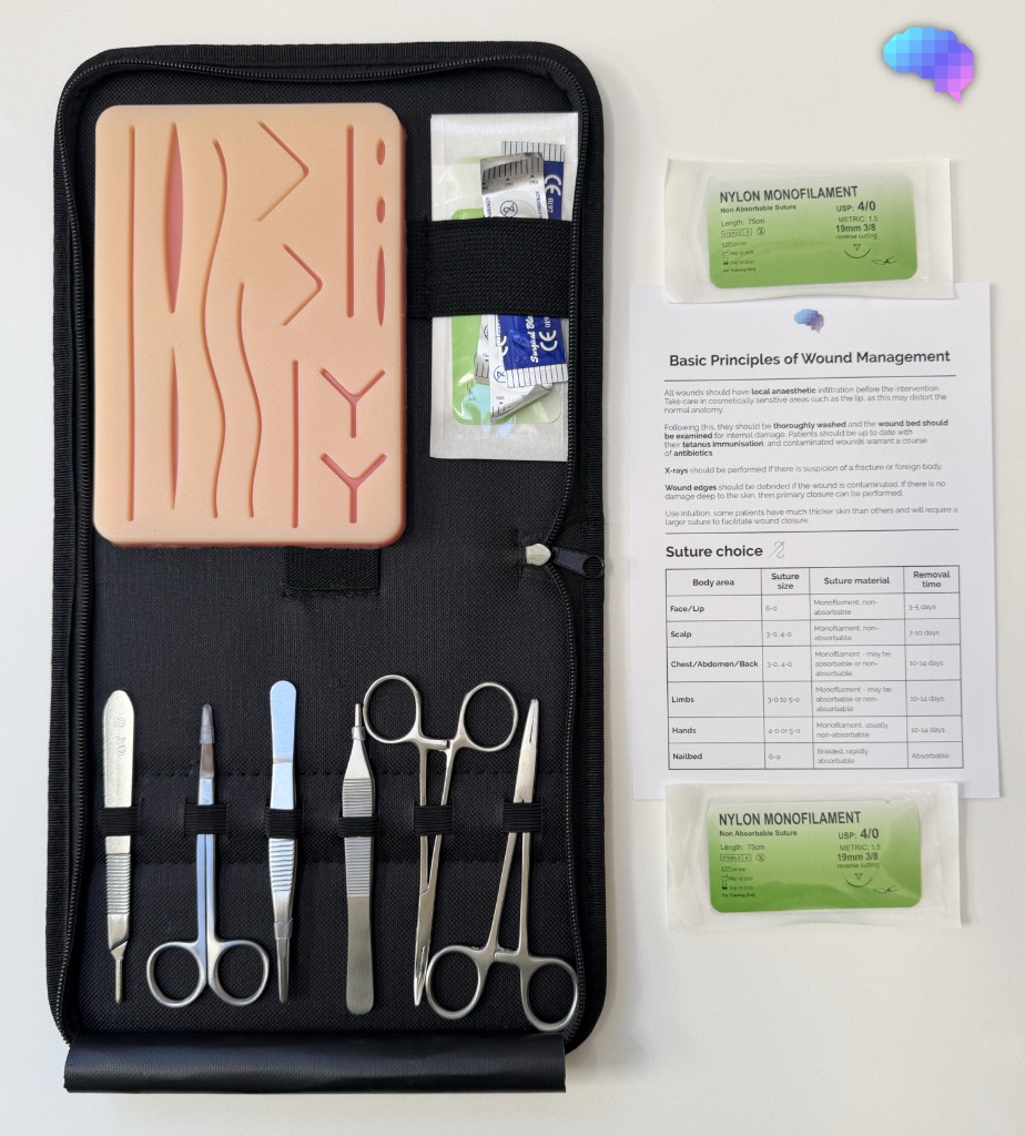 Practise essential suturing techniques with the Geeky Medics suture practice kit, featuring a realistic silicone suturing pad, stainless steel instruments, sutures and step-by-step guides.